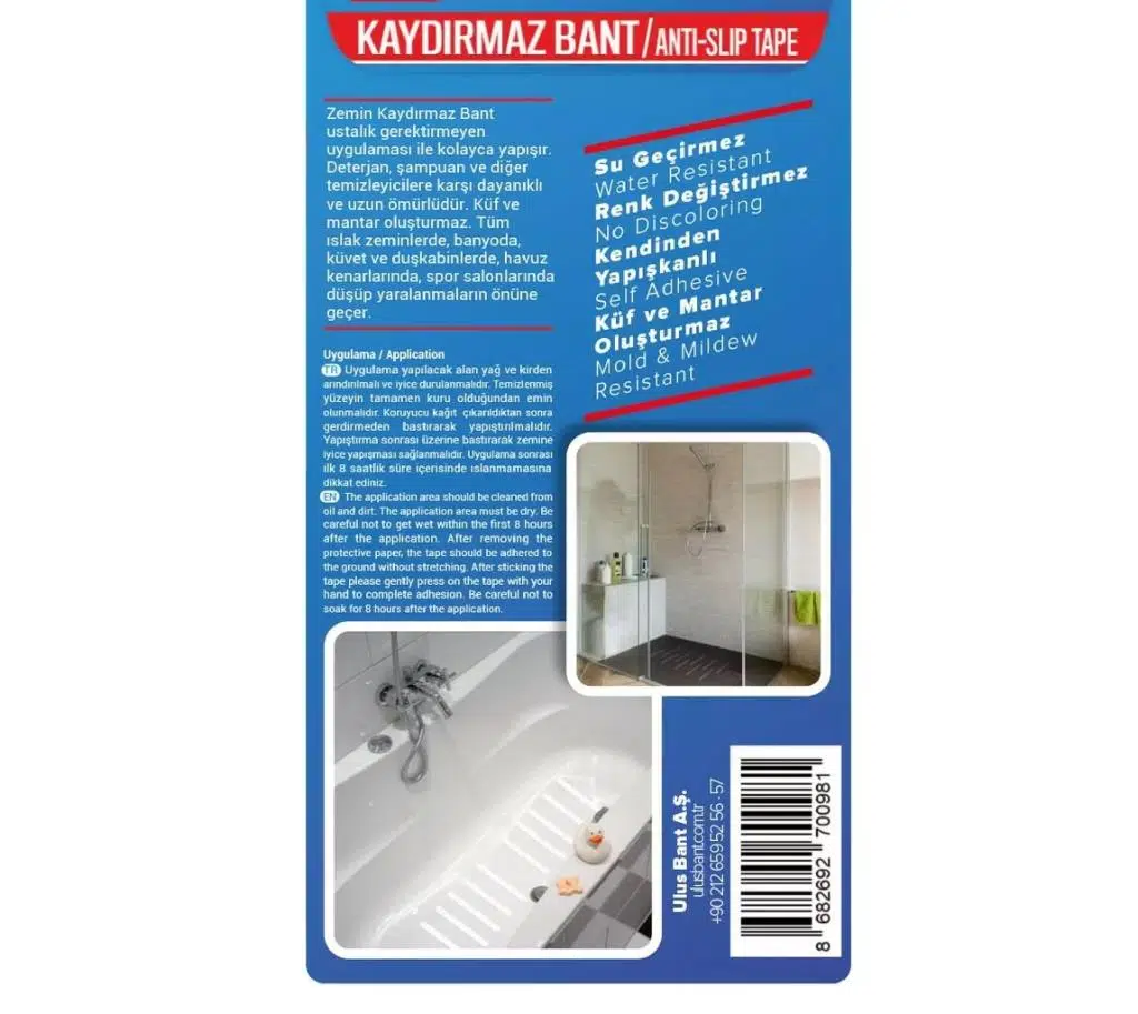 • Zemin Kaydırmaz Bant ustalık gerektirmeyen uygulaması ile kolayca yapışır. Deterjan, şampuan ve diğer temizleyicilere karşı dayanıklı ve uzun ömürlüdür. Küf ve mantar oluşturmaz. Tüm ıslak zeminlerde, banyoda, küvet ve duşkabinlerde, havuz kenarlarında, spor salonlarında düşüp yaralanmaların önüne geçer.