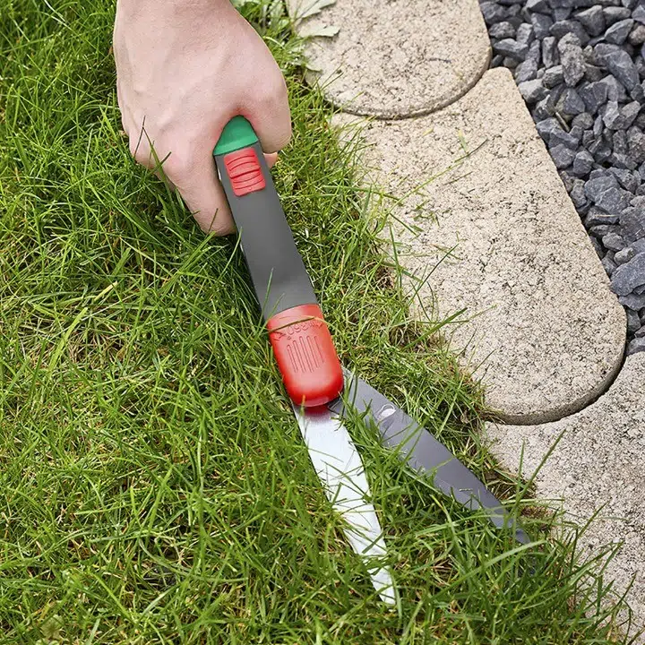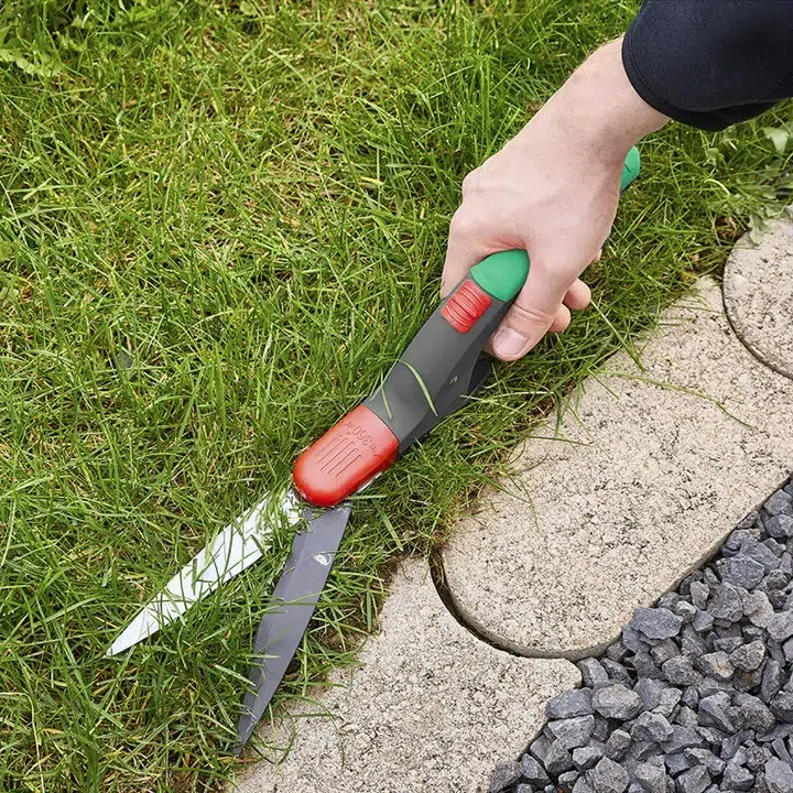 Hassas çim kenar kesme makası 360° dönebilir, ince, 16 pozisyonlu bir indeksleme sistemine ve iki bileşenli bir sapa sahiptir.