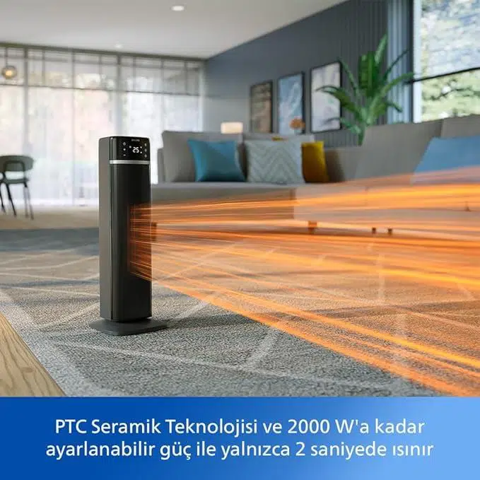 PTC seramik teknolojisi ile donatılmıştır: Hızlı ısıtma ve 2000 W'a kadar ayarlanabilir güç, sadece 2 saniyede ısınır ve sıcak havayı etkili bir şekilde yayar. 20 m2'ye kadar odalar için uygundur.