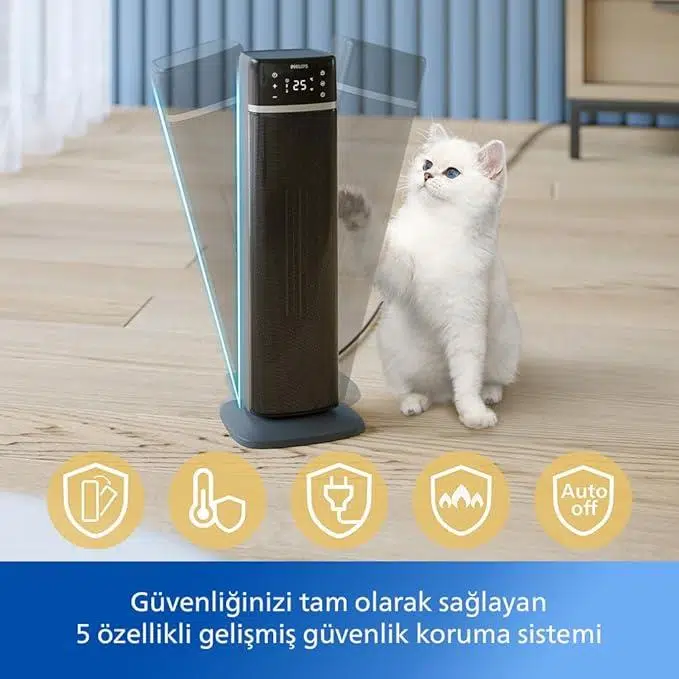 5 Dahili güvenlik özellikleri: Gelişmiş güvenlik sistemimizle gönül rahatlığının tadını çıkarın: Devrilmeye karşı koruma, aşırı ısınma koruması, kısa devreyi önlemek için güvenlik fişi, alev malzemeler ve güvenlik kapatma